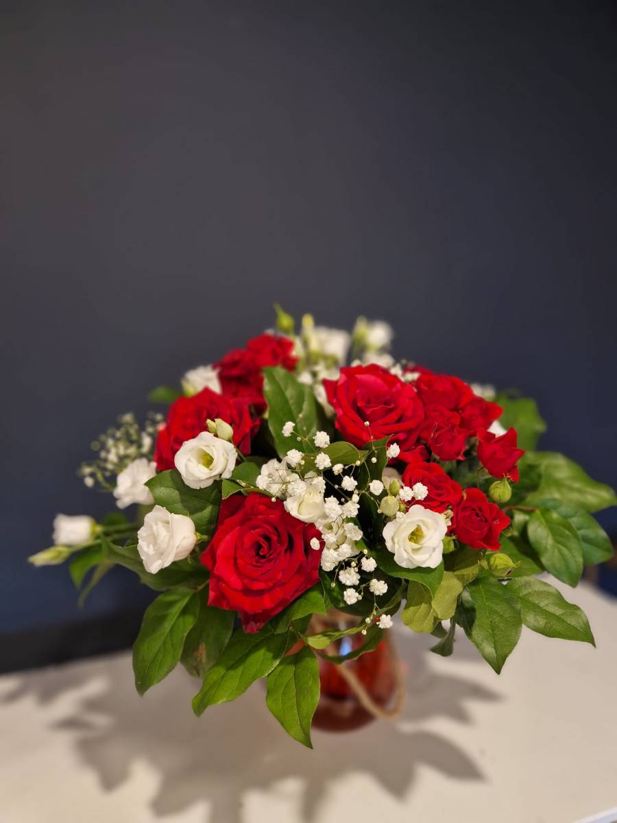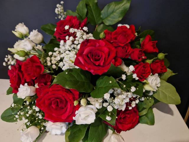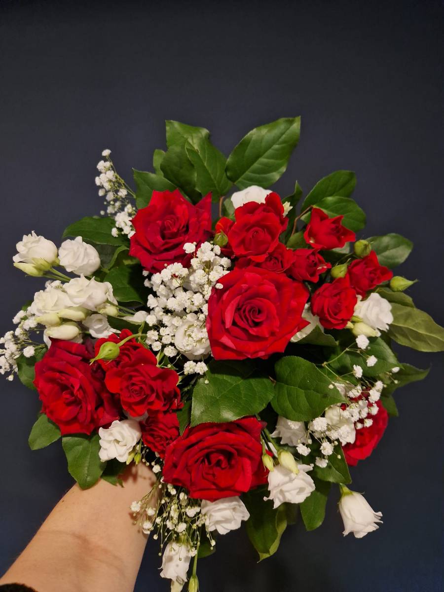 Le bouquet rond rouge & blanc symbolise la passion,le désir & l'envie d'un amour sincère.