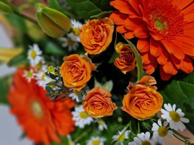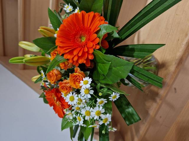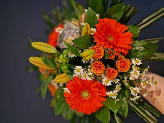 Le bouquet rond coloré orangé symbolise la joie de vivre, la gaïeté, la vitalité et l'équilibre de l'esprit & des sens.